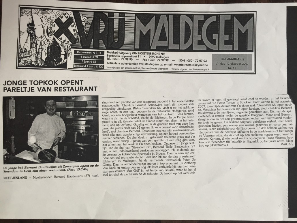 Ondanks z’n jonge leeftijd, kan de chef van ‘Steendam 66’, Bernard ‘Bolle’ Baudewijns, 27 jaar, al een indrukwekkend curriculum voorleggen. Hij studeerde aan de vermaarde koksschool Spermalie in Brugge. Daarna nam z’n carrière een wel erg snelle vlucht. Eerst kon hij aan de slag in restaurant ‘Elkerlyc’ in Maldegem, bij de vermaarde televisiekok Peter De […]